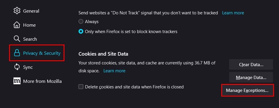 Abra as Configurações do Firefox e vá para a guia Privacidade e segurança. Role para baixo e localize o cabeçalho Cookies e dados do site. Clique em Gerenciar exceções ao lado da opção Excluir cookies e dados do site quando o Firefox for fechado. Localize o nome do site que você está tentando acessar , e verifique seu status. (Se aparecer bloqueado, seu navegador bloqueará automaticamente qualquer solicitação de cookie desse site) Selecione o site e clique em Remover site para removê-lo do status de bloqueado.