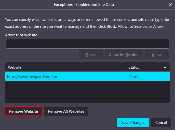 Se o método acima não permitir cookies para o site que você está tentando acessar, o Firefox pode ter bloqueado apenas esse site específico de permitir cookies.