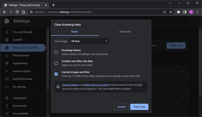 Clique no ícone de três pontos no Chrome e vá para Configurações > Privacidade e segurança > Cookies e outros dados do site. Marque Permitir todos os cookies. Volte para Privacidade e segurança e clique em Limpar dados de navegação. Marque Imagens e arquivos em cache e desmarque todas as outras opções. Clique em Limpar dados.