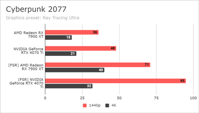 Comecei com o Cyberpunk 2077, um dos os jogos mais exigentes de hoje, especialmente se você quiser desfrutar de efeitos de traçado de raios. Em 1440p, ativar o FSR resultou em um aumento de framerate de 97% na AMD Radeon RX 7900 XT e quase 98% mais fps na GeForce RTX 4070 Ti. Em 4K, o FSR ofereceu um aumento ainda maior na taxa de quadros com a Radeon RX 7900 XT: 122%. Com a GeForce RTX 4070 Ti da NVIDIA, o aumento foi menor, mas ainda significativo: 52% mais fps.