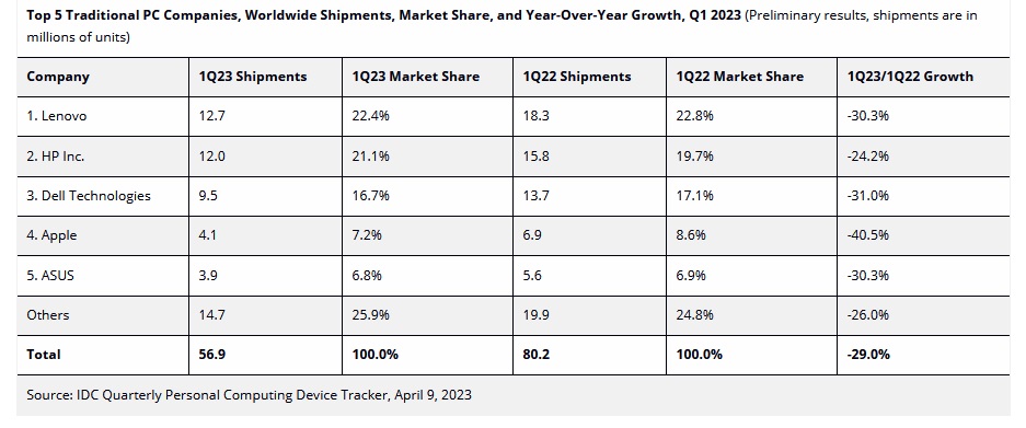 O relatório mostra que a Apple foi a mais atingida entre as principais marcas de PCs, que tiveram quedas de dois dígitos nas remessas. Lenovo, Dell, HP e Asustek também viram suas remessas caírem mais de 30%, enquanto o mercado geral de PCs contraiu 29%, para 56,9 milhões de unidades.