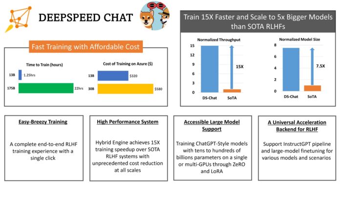 A Microsoft aponta que o DeepSpeed ​​Chat é capaz de treinar até 13 bilhões de parâmetros em uma GPU ou por US$ 300 ao aproveitar o Azure Cloud. A ferramenta também oferece suporte a modelos maiores de até centenas de bilhões de parâmetros usando as estratégias de otimização de memória do DeepSpeed, como ZeRO e LoRA.