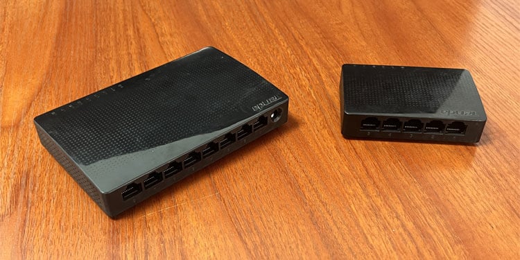Switches são dispositivos mais sofisticados que contêm várias portas de saída. Eles podem ter entre 5 e 52 portas, dependendo do dispositivo. Ao contrário dos divisores Ethernet que requerem duas portas, ele se conecta apenas a uma única porta no roteador.