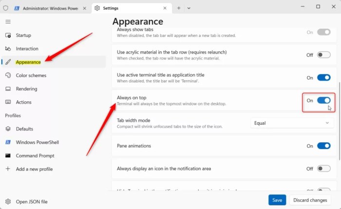 Conforme descrito acima, os usuários podem definir uma configuração do Terminal do Windows para iniciar o aplicativo e ficar por dentro de todas as outras janelas na área de trabalho.