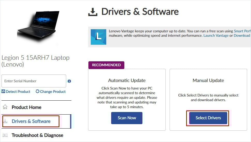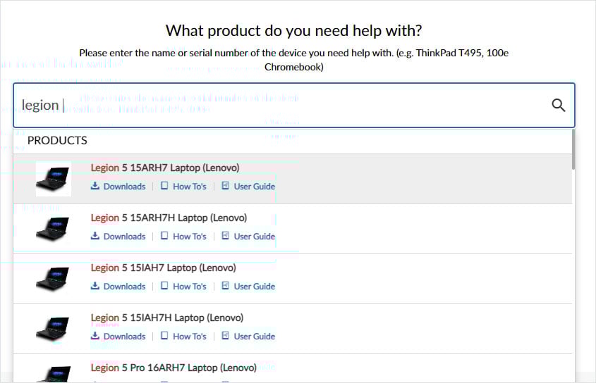 Acesse Página de suporte oficial da Lenovo. Na caixa de pesquisa, digite o modelo do seu laptop e clique em seu laptop na lista de dispositivos. Clique em Driver e software. Em Atualização manual, clique em Selecionar drivers.