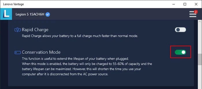 Alguns laptops Lenovo têm o modo de conservação ativado. Esse recurso interrompe o carregamento da bateria após atingir um limite especificado. Desativando esse recurso deve se livrar da mensagem e o laptop deve carregar normalmente. Mas problemas com a bateria ou o carregador do laptop também podem levar ao erro.
