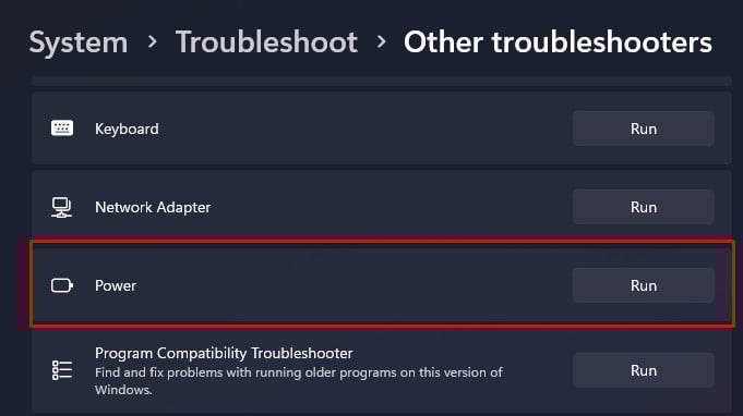 O solucionador de problemas de energia verifica problemas e complicações com o gerenciamento de energia do laptop. Isso inclui quaisquer problemas com o driver da bateria ou configurações de energia que possam interromper o carregamento do laptop.