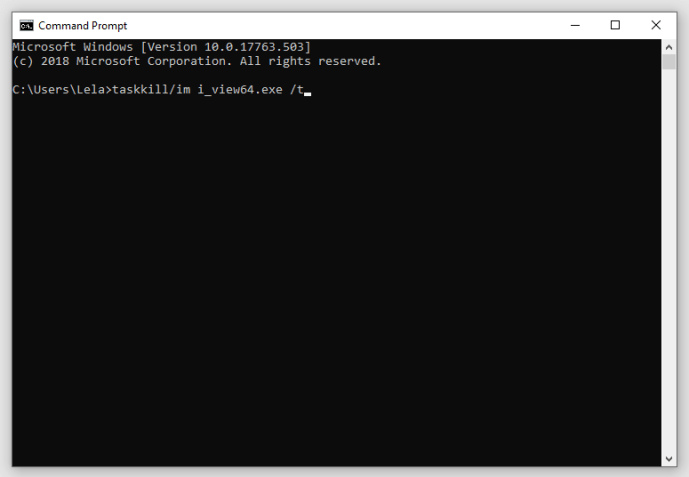 Digite “Cmd” na pesquisa do Windows e clique no aplicativo nos resultados para executá-lo. Digite taskkill/im “filename.filetype”/t. O exemplo Filetype neste comando será”i_view64″e o Filetype será”.exe”