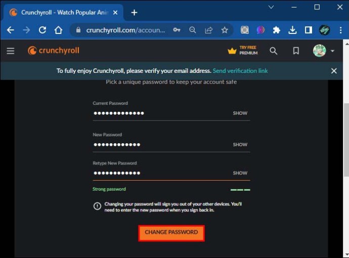 Crunchyroll enviará uma notificação por e-mail confirmando a atualização bem-sucedida da senha da sua conta.