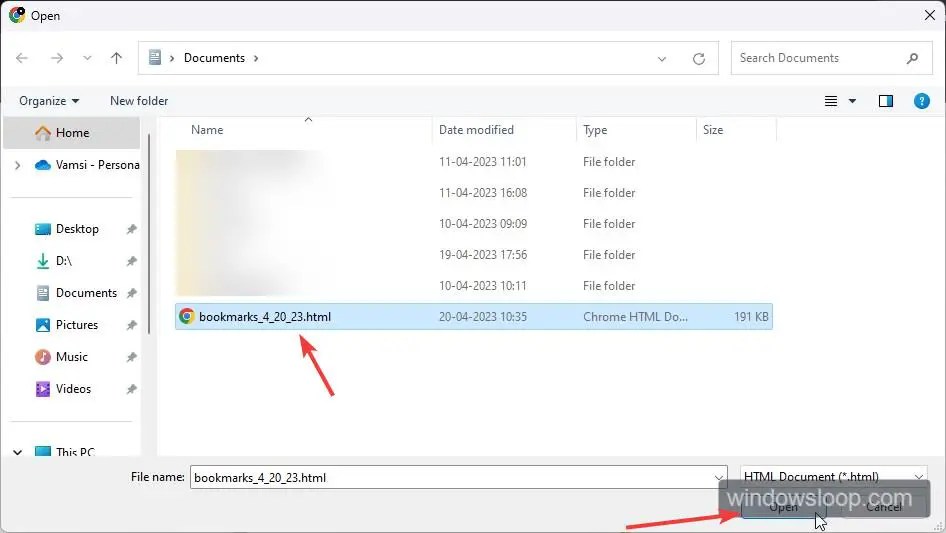 Agora, abra a pasta salva, selecione o arquivo de favoritos do Chrome e clique no botão”Abrir”.