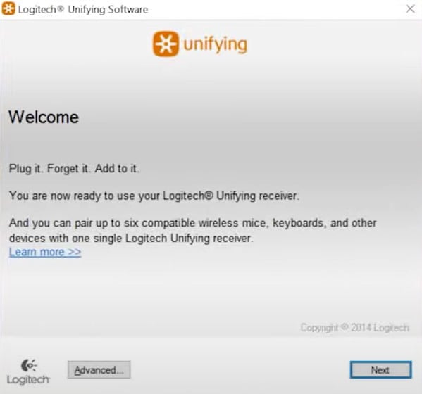 Certifique-se de que o receptor esteja conectado ao PC e ao mouse está ligado. Baixe o Logitech Unifying Software. Instale e execute o Logitech Unifying Software. Usando a tecla tab, selecione Avançar.