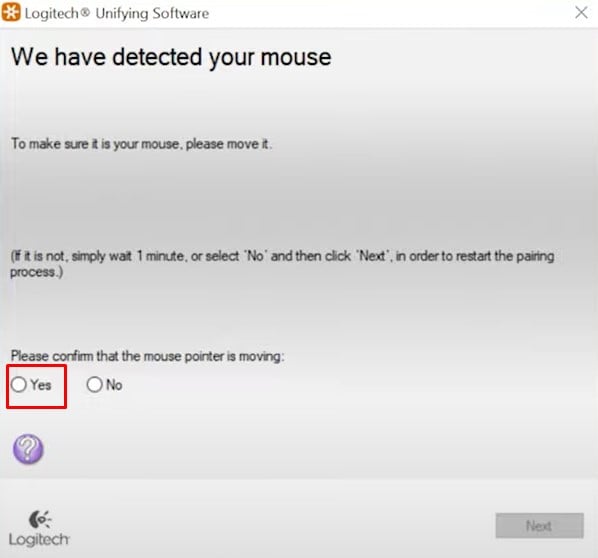 Desligue o mouse e ligue-o novamente. O aplicativo agora deve detectar o mouse. Confirme isso movendo o cursor do mouse. Marque Sim e selecione Avançar. Se o software Unifying não estiver detectando o mouse, marque Não e selecione Avançar. Ao fazer isso, o aplicativo tentará emparelhar o receptor com o mouse.
