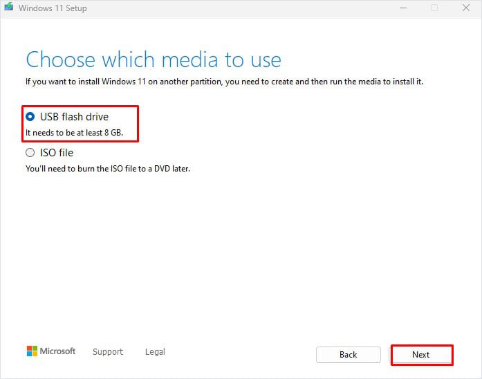 Selecione Avançar. Marque unidade flash USB e selecione Avançar.