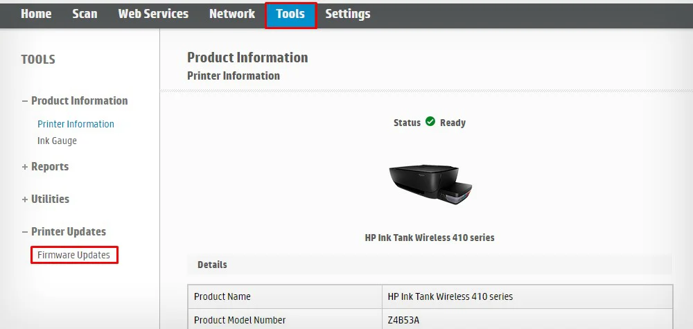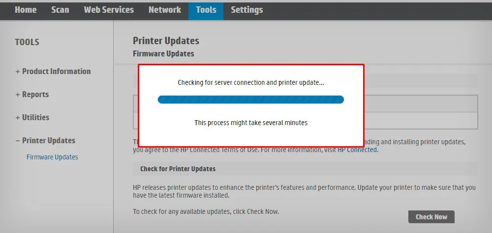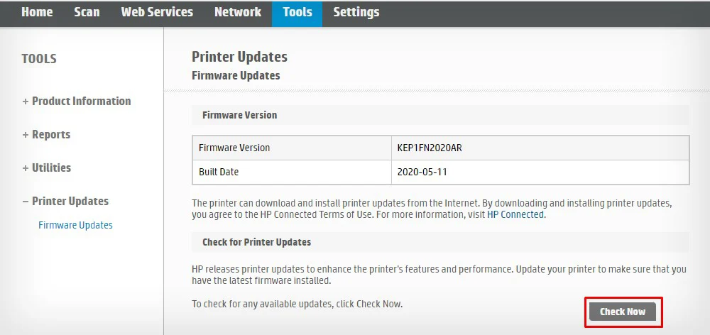 Primeiro, encontre o endereço IP da impressora. Abra o endereço IP em seu navegador da web. Clique no menu Ferramentas e selecione Atualizações da impressora > Atualizações de firmware. Toque em Verificar agora. Em seguida, siga as instruções para concluir a atualização do firmware.