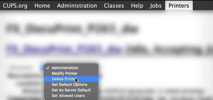Se a redefinição do sistema de impressão não funcionou, sugiro que você use a interface CUPS avançada para remover e adicionar novamente a impressora para o seu Mac.