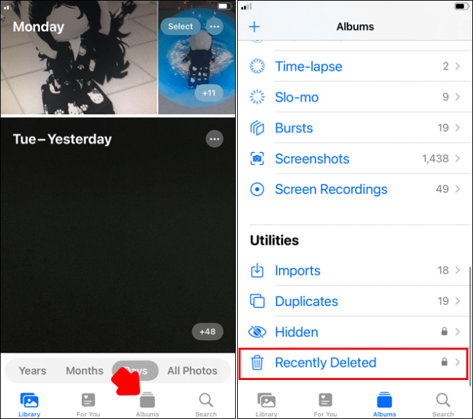 Toque em”Álbuns”e role para baixo até a guia”Excluídos recentemente”. Isso deve abrir uma pasta com uma lista de todas as fotos e vídeos que você foram excluídos nos últimos 30 dias.