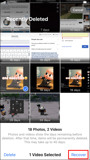 Percorra a lista para encontrar os vídeos que deseja recuperar. Para recuperar um arquivo, dê um toque longo e pressione o botão”Recuperar”no canto inferior direito da tela.