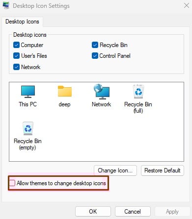 Aqui, desmarque Permitir que os temas alterem os ícones da área de trabalho.