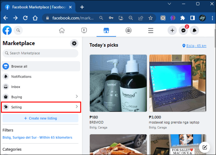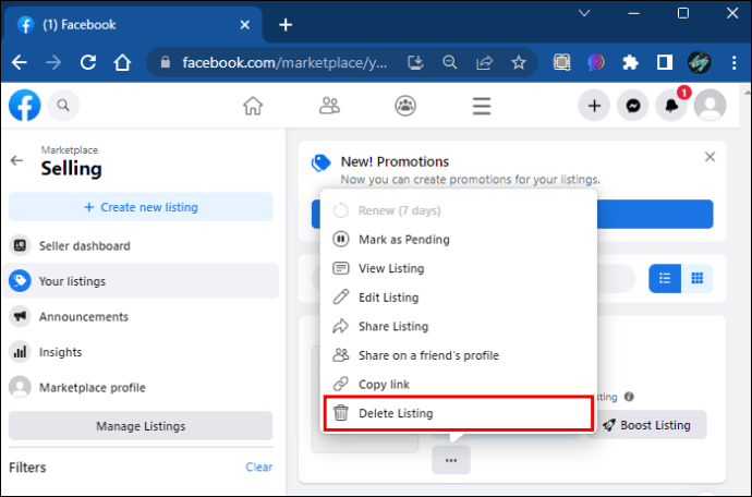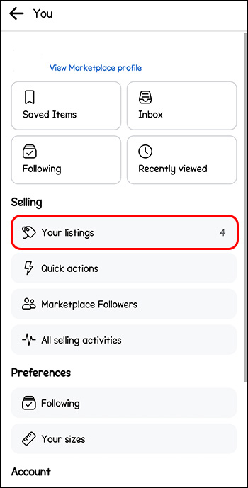 Ao alterar suas listagens, o Facebook Marketplace permite excluí-las, editá-las e até mesmo republicá-las para maior visibilidade. Se você estiver usando seu navegador, poderá encontrar suas listagens no menu à esquerda em”Mercado”. Como alternativa, você pode encontrar suas listagens no menu de três linhas à direita usando o aplicativo.