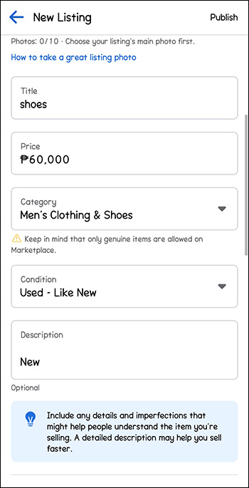 Ao inserir informações sobre sua listagem, tente torná-la o mais detalhada possível. Os potenciais compradores vão querer saber sobre a condição e quaisquer especificações específicas. Não use fotos ou imagens do produto da empresa para a imagem da listagem. Tire as fotos você mesmo para que a condição do item fique aparente.