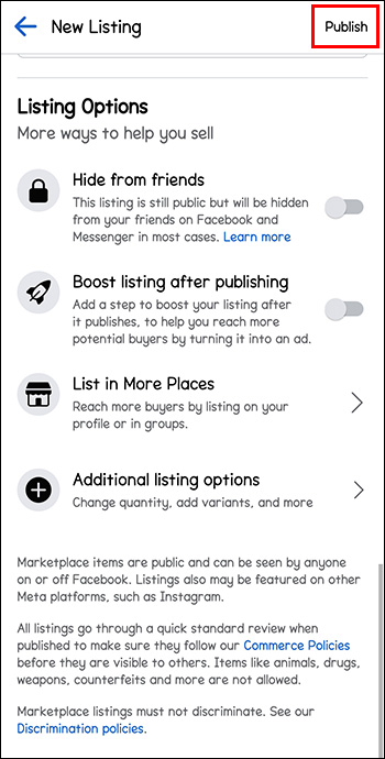 Selecione”Avançar”e depois”Publicar”para tornar sua listagem pública para compradores em potencial.