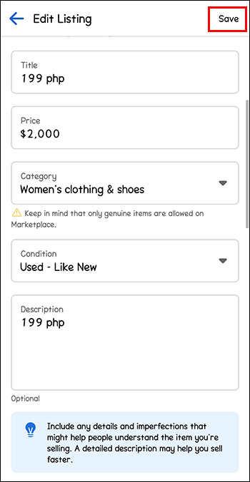 Ao fazer a nova listagem editada para sua postagem no Facebook Marketplace, use as informações atualizadas e verifique novamente antes de postar. Insira as mesmas informações da postagem anterior para atualizar a listagem e ganhar visibilidade. Você pode copiar e colar as informações de sua listagem em um documento separado se tiver problemas para lembrar a descrição antes de excluí-la.