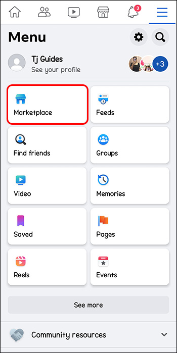 Selecione o menu à direita com as três linhas e selecione a opção”Mercado”. Você pode precisar curtir”Ver mais”antes que a opção se torne visível.