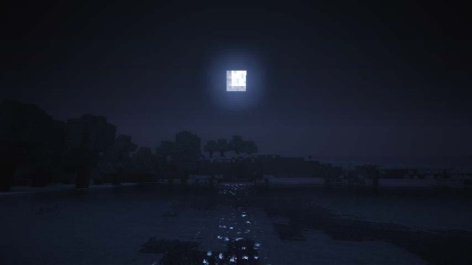 Quando o dia vira noite no Minecraft, seu Relógio representa essa mudança tornando o fundo azul preto. O sol amarelo também é substituído por uma lua, embora o relógio seja funcionalmente o mesmo. Quando a lua atinge o topo do seu relógio, é meia-noite. Novamente, você pode extrapolar o tempo a partir daí. A lua do lado esquerdo do relógio mostra que é o final da tarde e o início da noite, e a lua do lado direito mostra as primeiras horas da manhã.
