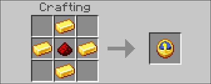 Arraste um lingote de ouro para os blocos central superior, central inferior, central esquerdo e central direito da grade. O resultado deve se parecer com um sinal “+”, com o Redstone Dust no meio.