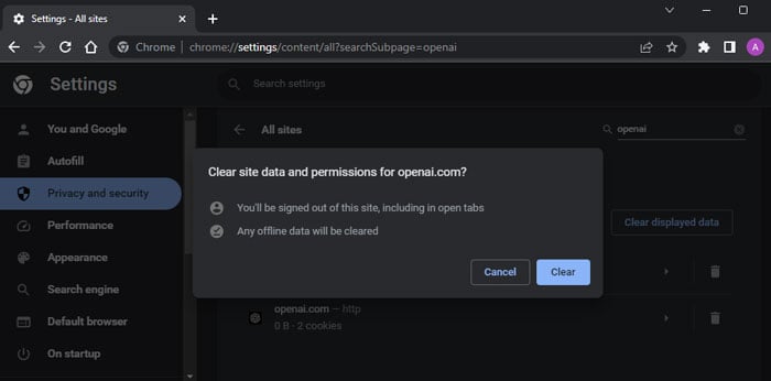 Clique no ícone de ponto triplo na barra de menu e vá para Configurações. Vá para Privacidade e segurança > Cookies e outros dados do site > Veja todos os dados e permissões do site. Pesquise por openai na barra de pesquisa. Clique no ícone Excluir ao lado de openai.com e selecione Limpar.