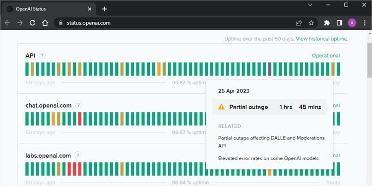 Às vezes, o servidor Open AI pode estar fora do ar ou com problemas técnicos. Portanto, a primeira coisa que você deve fazer é verificar o status do servidor ChatGPT para ver se ele está funcionando corretamente. O site mostra um histórico de todos os erros.