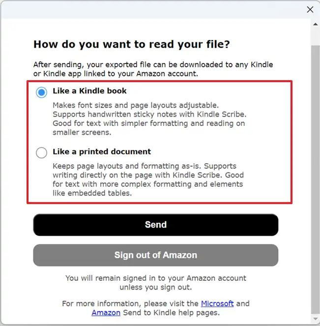 O recurso oferece duas opções, incluindo”Curtir um livro do Kindle”ou”Curtir um documento impresso”. uma inicialização do Kindle”permite ajustar tamanhos de fonte e layouts de página e é mais adequado para texto com formatação mais direta e leitura em telas menores. Ele também oferece suporte a notas adesivas manuscritas com o Kindle Scribe.