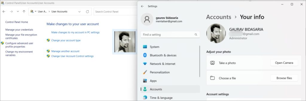 No entanto, às vezes, quando você tenta abrir uma opção ou configuração no Painel de controle, o Windows abre no aplicativo Configurações. Portanto, se você quiser fazer alterações em sua conta de usuário no Painel de controle em Contas de usuário > Contas de usuário > Fazer alterações em minha conta, você será redirecionado para Configurações > Contas > Informações em vez disso.