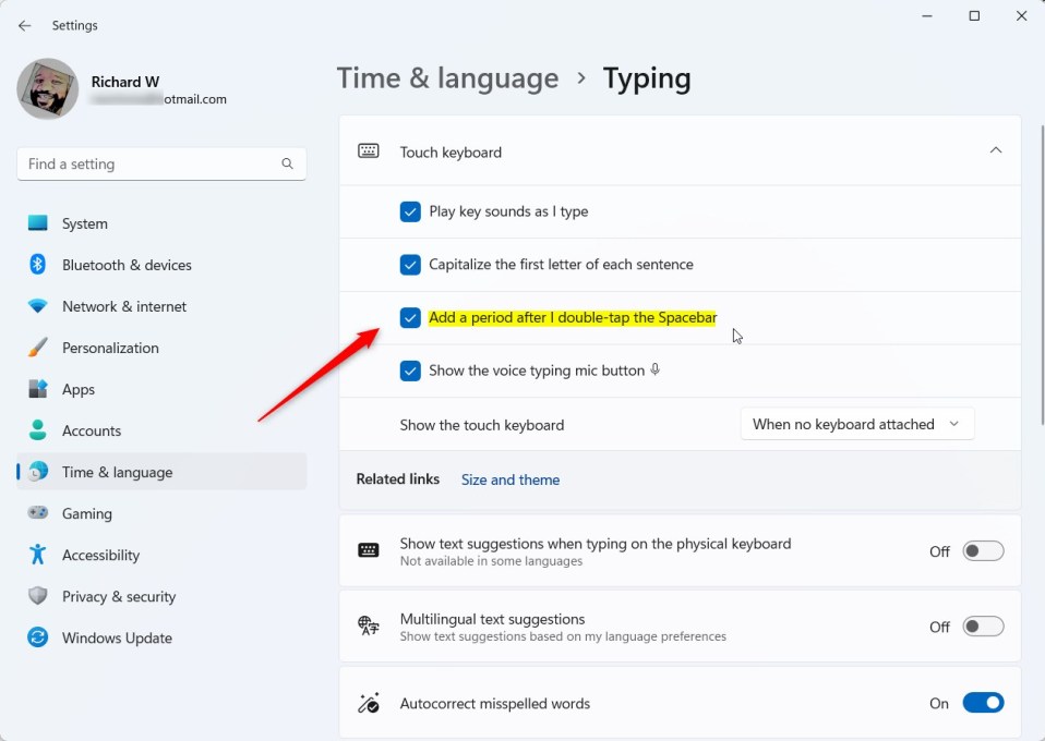 Selecione e expanda o bloco Teclado de toque no painel de configurações Hora e idioma-> Digitação e, em seguida, marque a caixa ao lado de Adicionar um ponto após tocar duas vezes na barra de espaço para ativá-lo.