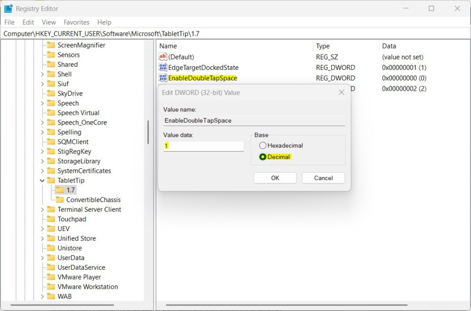Clique duas vezes no nome do novo item de chave (EnableDoubleTapSpace) e certifique-se de que a opção Base é Decimal e, em seguida, atualize os Value data: