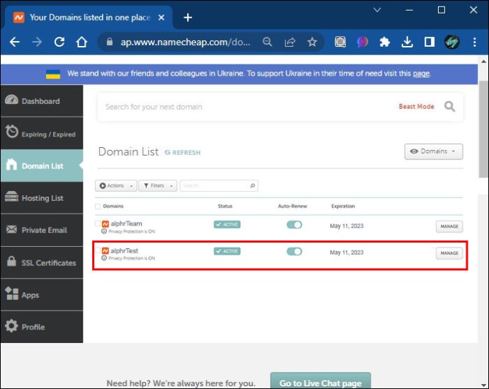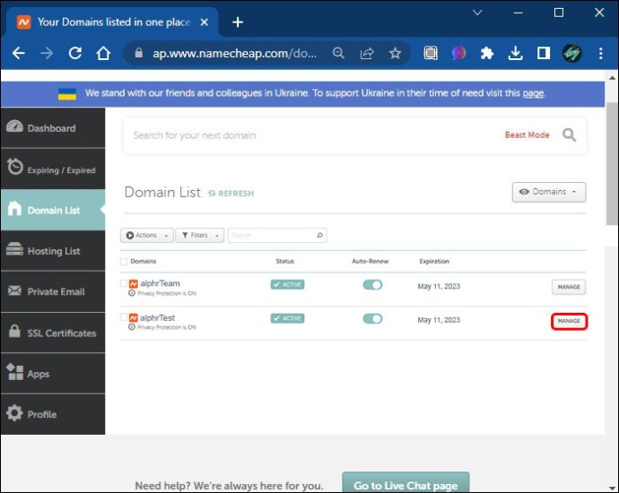 Clique no botão”Gerenciar”à direita do nome do domínio.