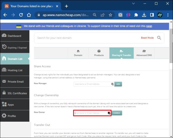 No campo”Novo proprietário”, insira o nome de usuário Namecheap do novo proprietário ou o e-mail endereço que eles usam para suas contas.