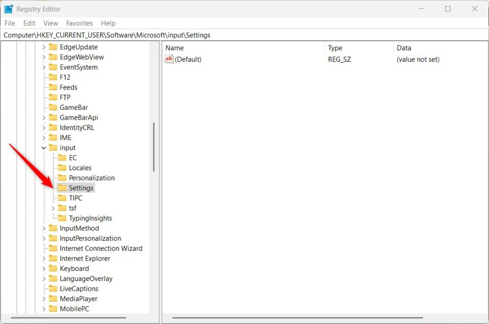Se você não vir a chave da pasta Settings , clique com o botão direito do mouse na chave Input e crie a subchave (Settings ) pastas.