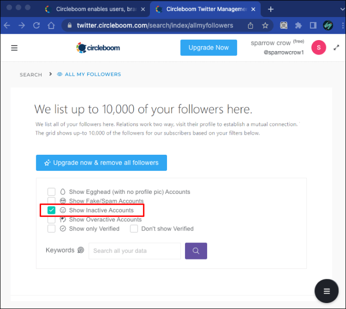 O site exibirá sua lista de seguidores, com várias opções para filtrá-los. Certifique-se de marcar”Mostrar contas inativas”para exibir apenas esses usuários.