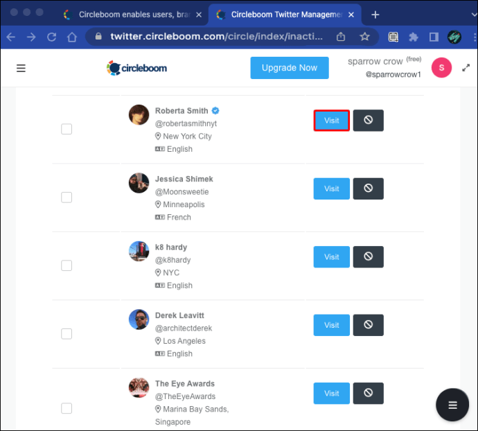 O aplicativo levará um momento para escanear seus amigos e exibir a lista de usuários inativos.Se você deseja remover algum deles, clique no botão”Visitar”para acessar o perfil. A página do Twitter será aberta em uma nova janela.