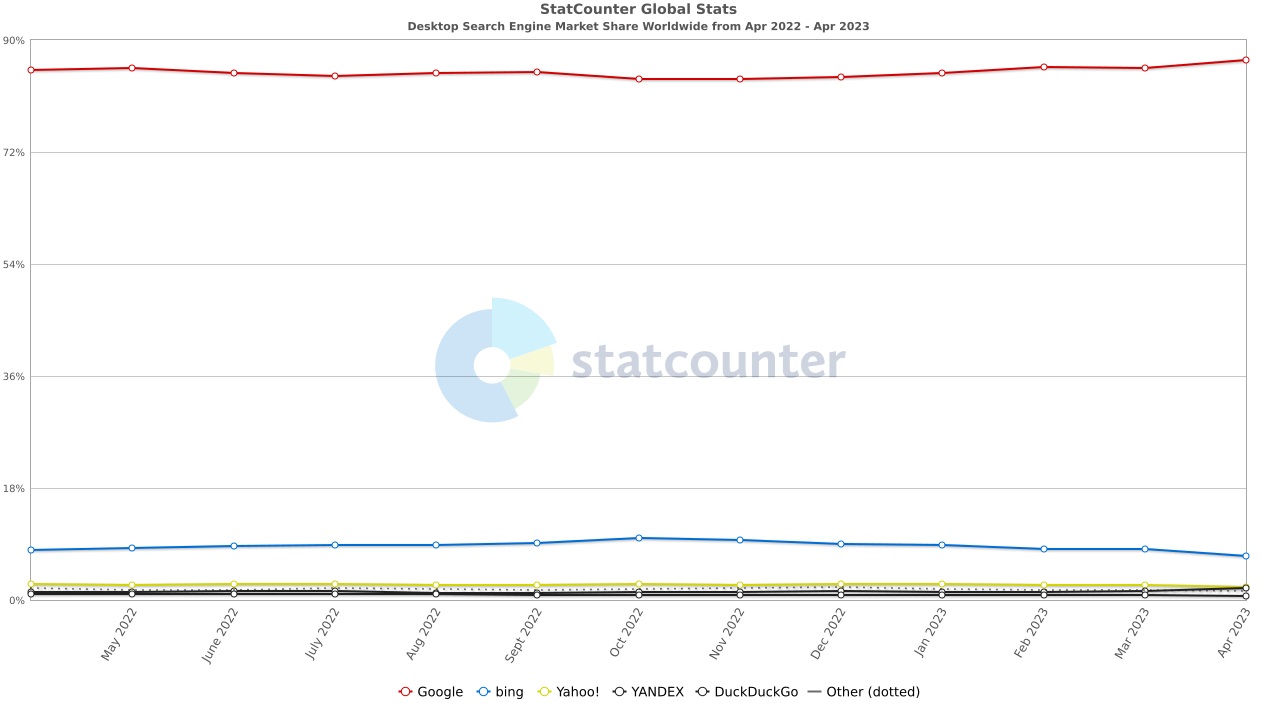 Curiosamente, a participação de mercado de 7,14% em abril de 2023 é uma queda ano a ano. Durante abril de 2022, o Statcounter mediu o Bing como tendo uma participação de 8,05% no mercado de desktop. Quando você adiciona dispositivos móveis e todos os dispositivos à equação, é ainda pior. O Bing tem apenas 2,79% de participação no mercado geral, enquanto o Google continua a dominar com 92,63%.