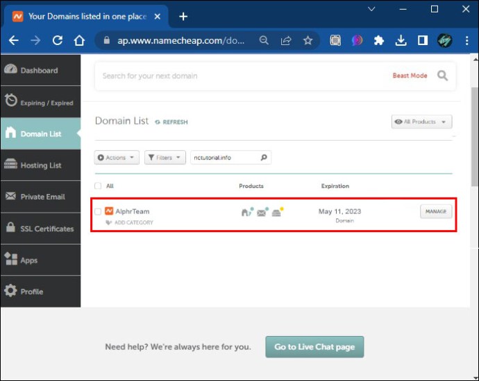Localize o domínio que deseja transferir e clique no botão”Gerenciar”.