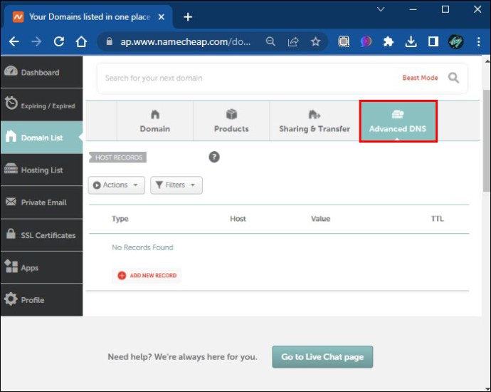Vá para a guia”DNS avançado”na parte superior da página do domínio.