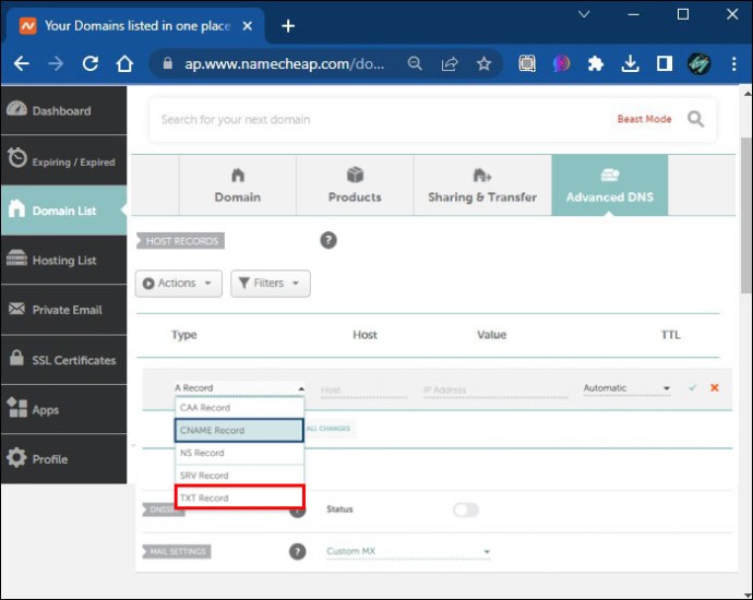 Para adicionar um registro TXT no Namecheap, siga estas etapas: