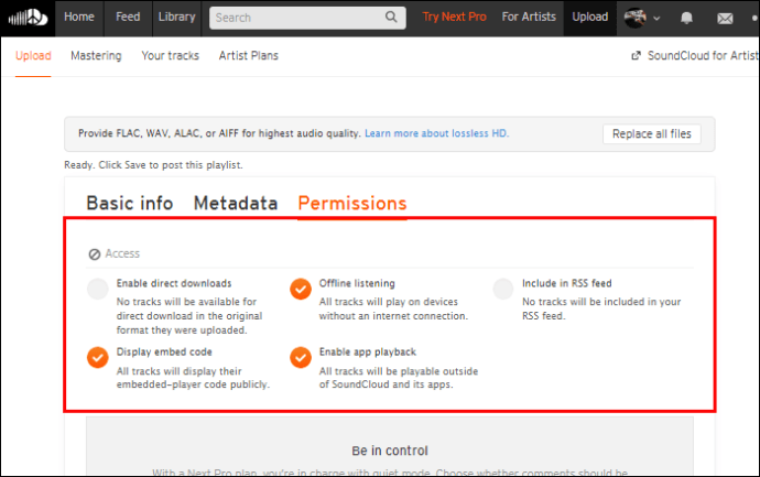 Na guia”Permissões”, marque os círculos ao lado do opções que você deseja oferecer aos seus ouvintes (downloads, audição off-line etc.).