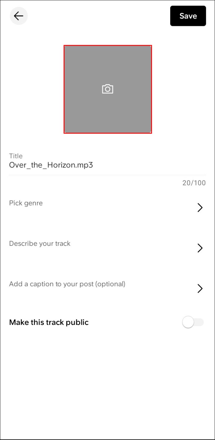 Adicione uma foto e nome da faixa, escolha um gênero, adicione uma descrição, adicione um legenda se quiser e marque a opção se quiser tornar a faixa privada.