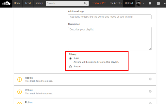 Observação: você pode manter seu álbum ou faixas privadas primeiro e depois revelá-las quando decidir lançar seu álbum. No entanto, certifique-se de que as faixas e o álbum inteiro sejam revelados simultaneamente porque a privacidade do seu álbum não afeta a privacidade das suas faixas.