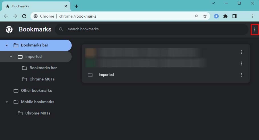 Clique no menu do Chrome (ícone de reticências verticais) no canto superior direito. Selecione Favoritos e clique em Gerenciador de favoritos.