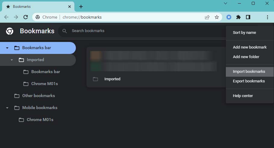 Observação: Se você não tiver nenhum marcador em seus favoritos barra, importar uma pasta HTML de favoritos adicionará todos os favoritos diretamente à sua barra de favoritos. Se você já tiver favoritos em sua barra de favoritos, os favoritos importados serão adicionados a uma nova pasta Importados no final de sua barra de favoritos.