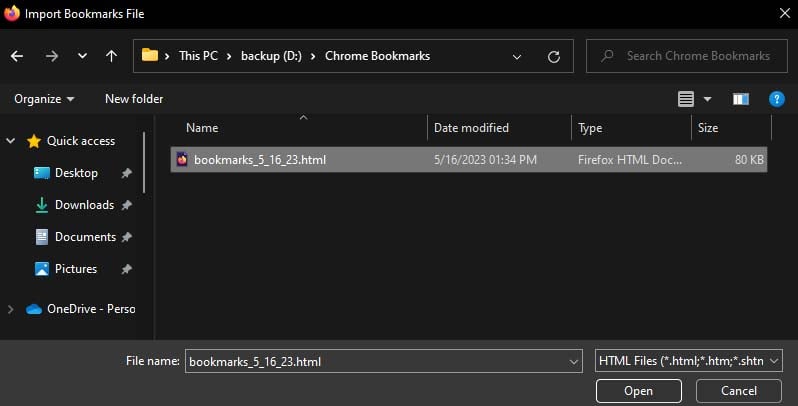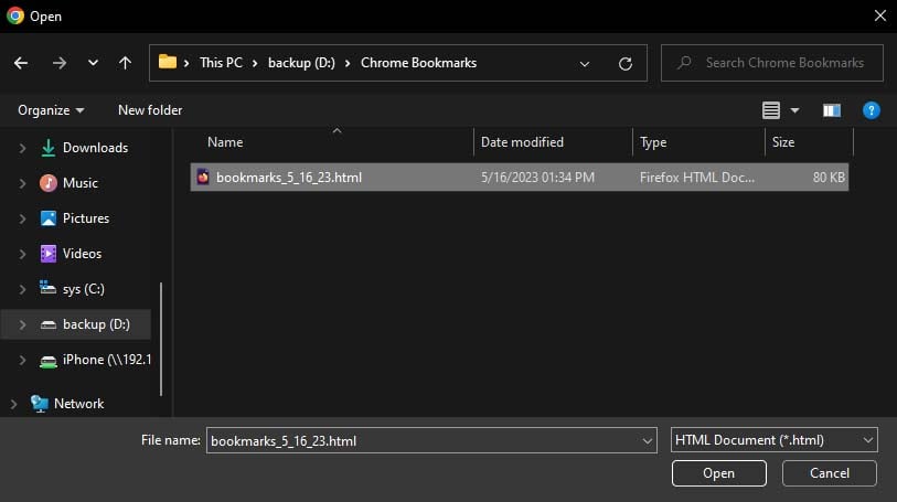 Navegue até o local onde você salvou seu arquivo HTML de favoritos. (Se estiver tentando importar os favoritos em outro dispositivo, verifique se o arquivo HTML foi transferido para esse dispositivo.) Clique duas vezes no arquivo HTML dos favoritos.